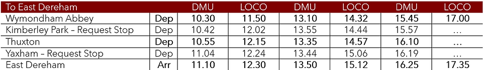 *Please note that whilst every effort is made to the advertised traction & services we do reserve the right to amend, alter or cancel service, The Mid-Norfolk Railway does not accept any responsibility for any inconvenience caused.